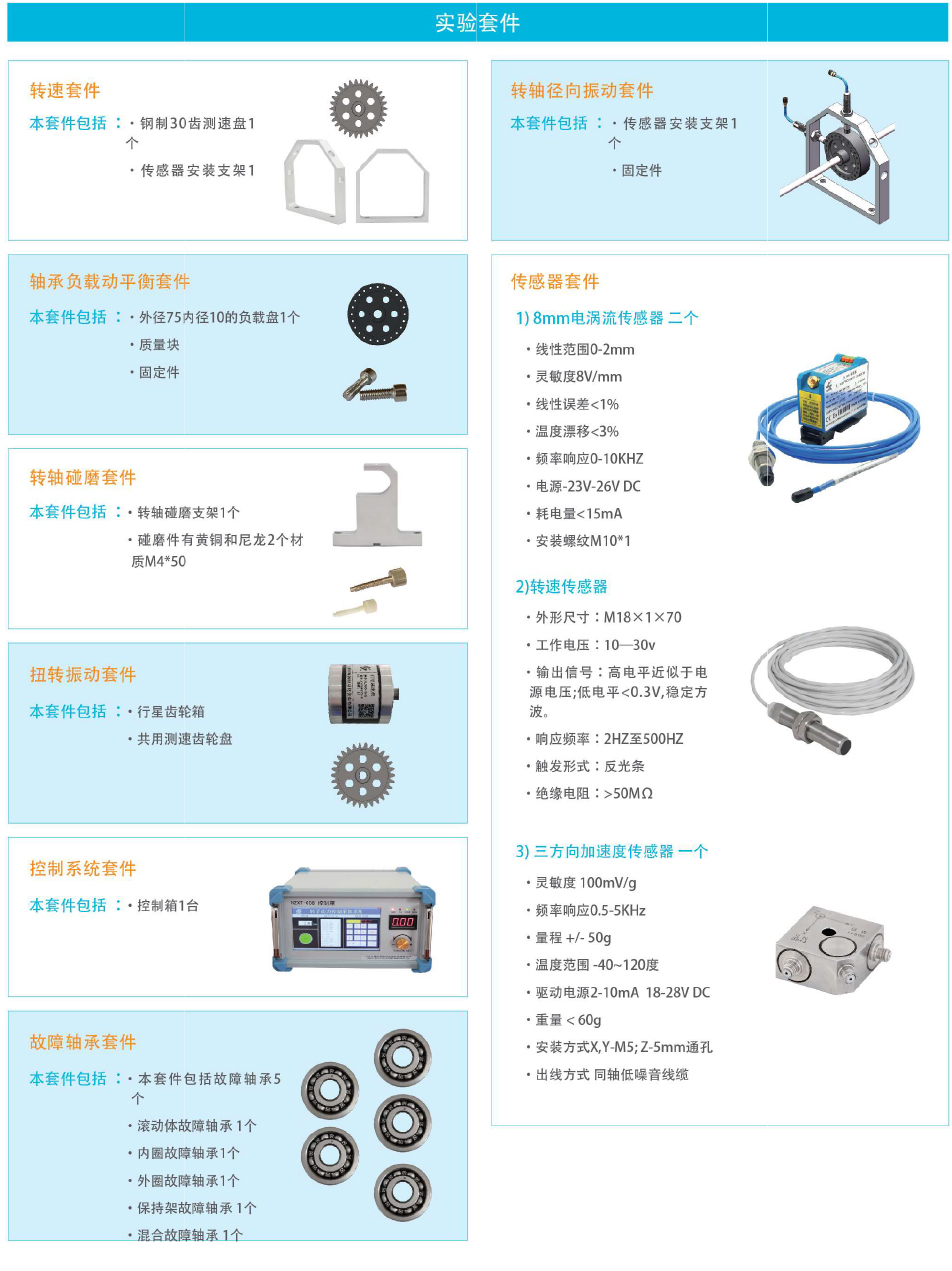 该转子实验台具有结构简单,拆装方便,操作简便,性能稳定的特点。此设备可灵活配置各类传感器,能对多种常见的旋转机械故障进行故障特征分析。与本公司开发的数据采集系统配套使用,形成一个多用途,综合型的实验系统平台,为从事转子动力学及相关课程探讨的研究人员提供了一个良好的实验分析环境。