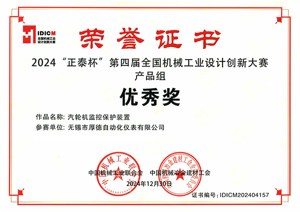 2024年12月24日,由中国机械工业联合会、中国机械冶金建材工会共同组织的“正泰杯”第四届全国机械工业设计创新大赛在上海成功举办,大赛以加快形成新质生产力、推进新型工业化为发展目标,展示我国装备制造业的创新设计能力。在此次大赛中,我公司的参赛作品“汽轮机监控保护装置”荣获大赛优秀奖。