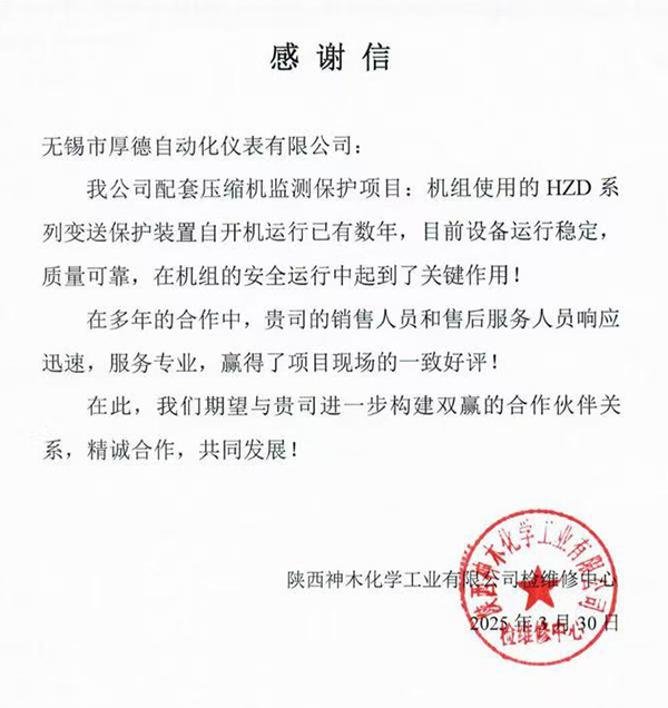客户在信中表达了与我司进一步深化合作、构建双赢伙伴关系的期待。我们深知,客户的认可是我们前行的动力,客户的信赖是我们宝贵的财富。未来,我们将继续以“匠心”打磨产品,以“初心”践行服务,与更多合作伙伴携手,为工业安全与智能化发展注入厚德力量!