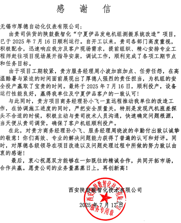 宁夏伊品发电机组测振系统改造项目的圆满成功,是我司与陕鼓数智化精诚合作的又一典范。我们衷心期待与陕鼓数智化及广大合作伙伴一如既往,深化合作,共同开拓更广阔的市场,在智慧工业、数字化转型的浪潮中,实现更高层次的合作共赢!