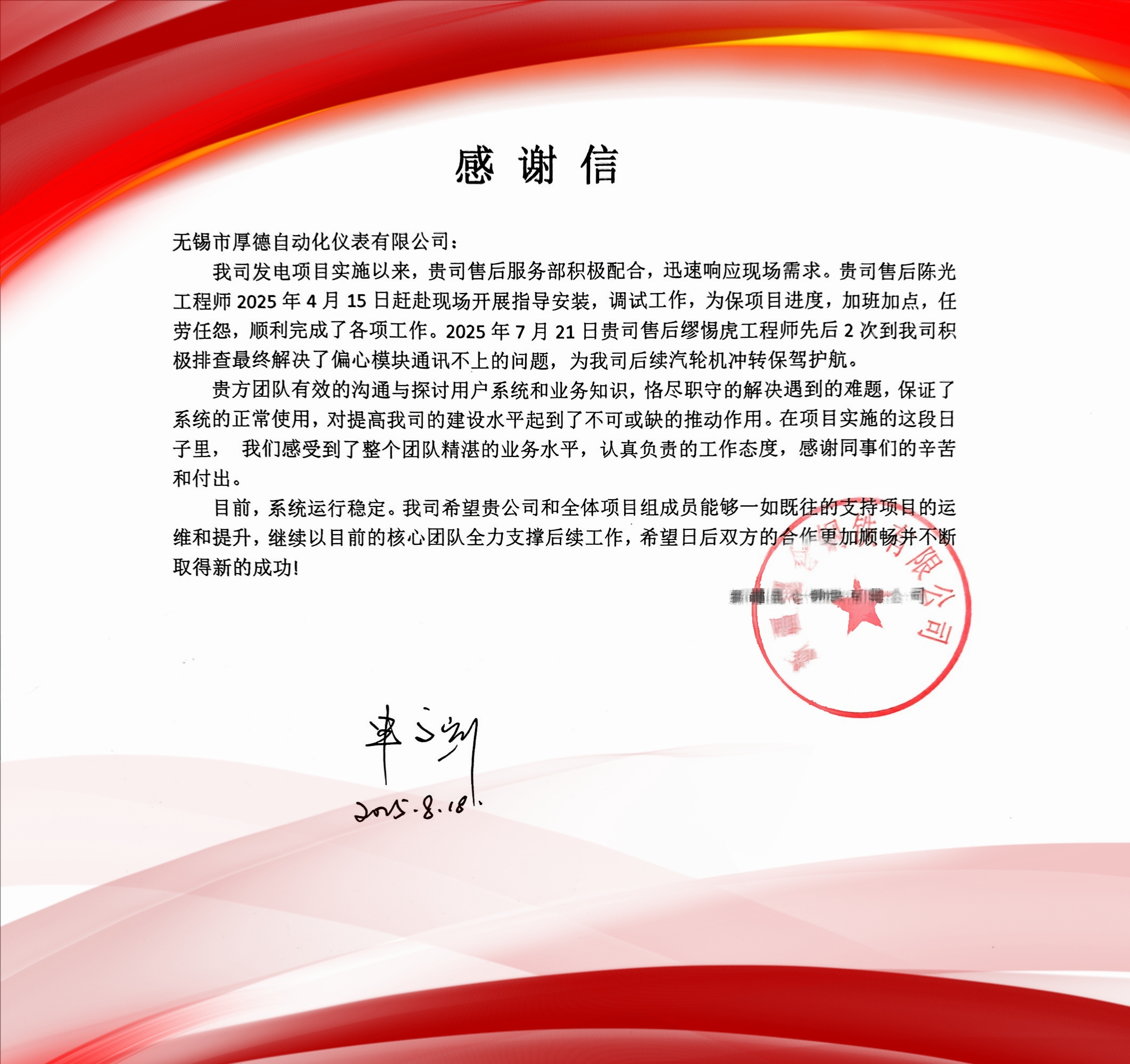 近日,我司收到来自某客户单位的一封热情洋溢的感谢信,字里行间充满对厚德仪表售后服务团队专业能力与服务态度的充分肯定。