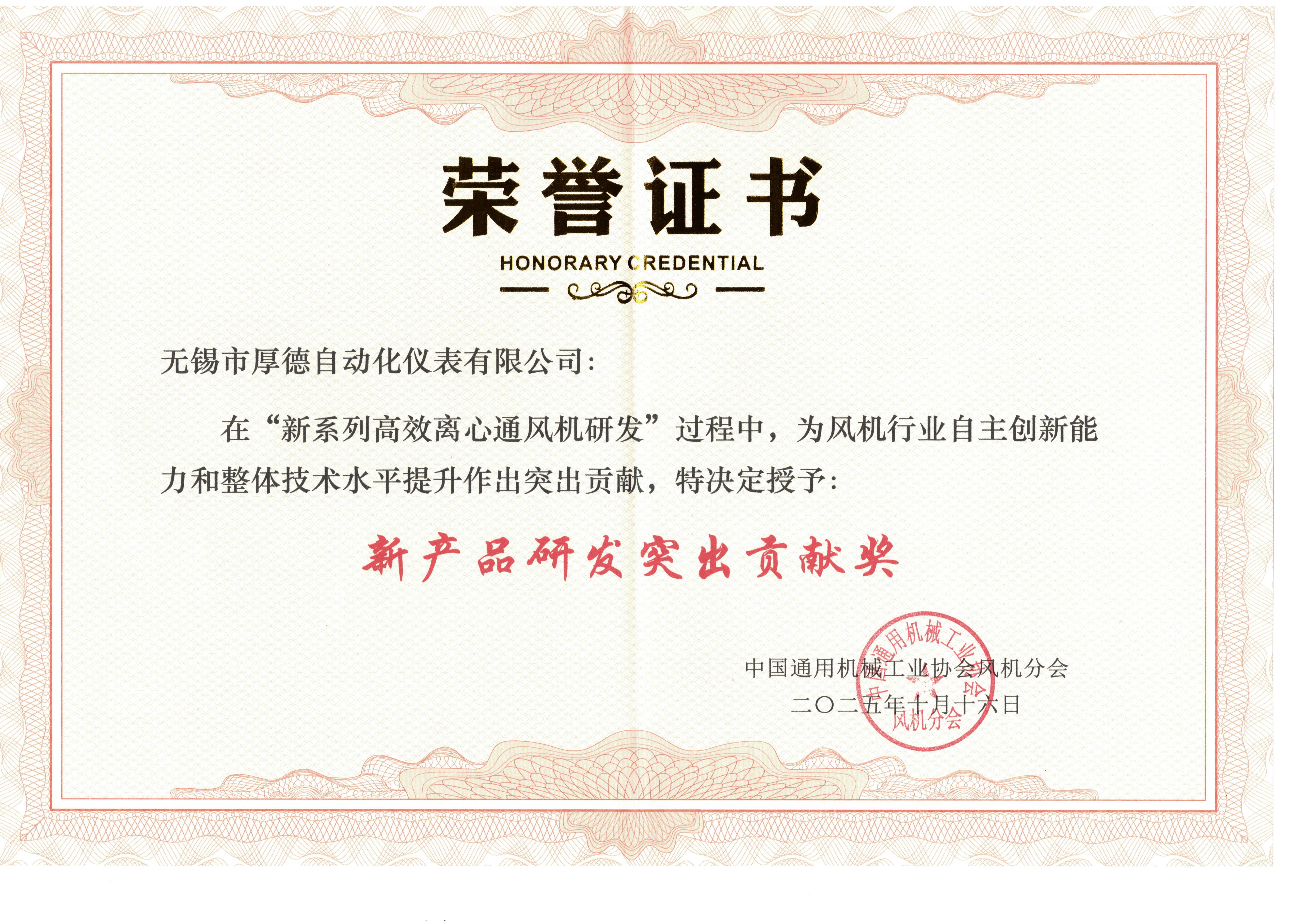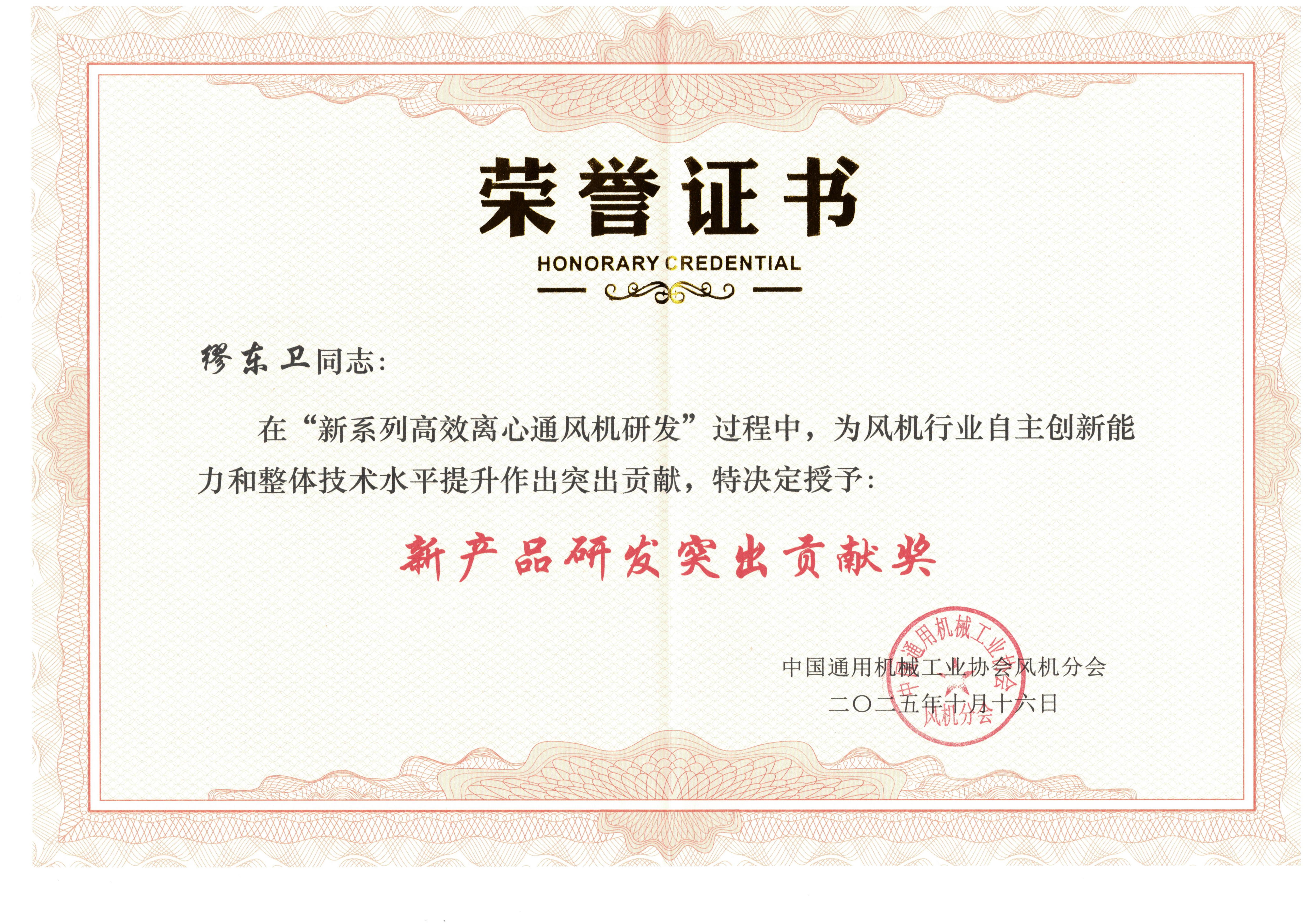 会议期间,协会对本次“新系列高效离心通风机研发”中的突出贡献企业予以表彰, 我司被授予“新产品研发突出贡献奖”。同时,我司总工程师缪东卫也因在该研发过程中发挥重要作用,荣获个人“新产品研发突出贡献奖”。