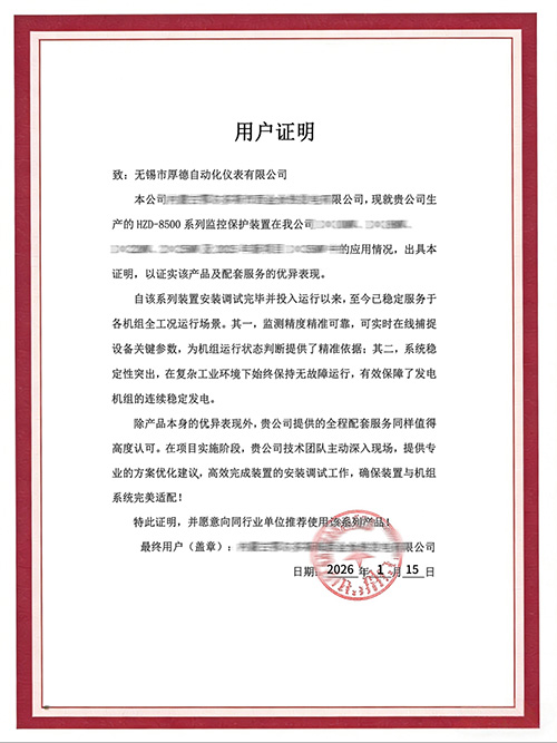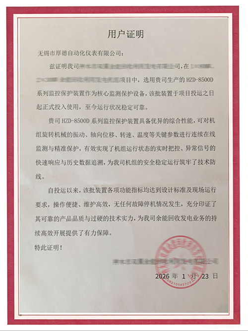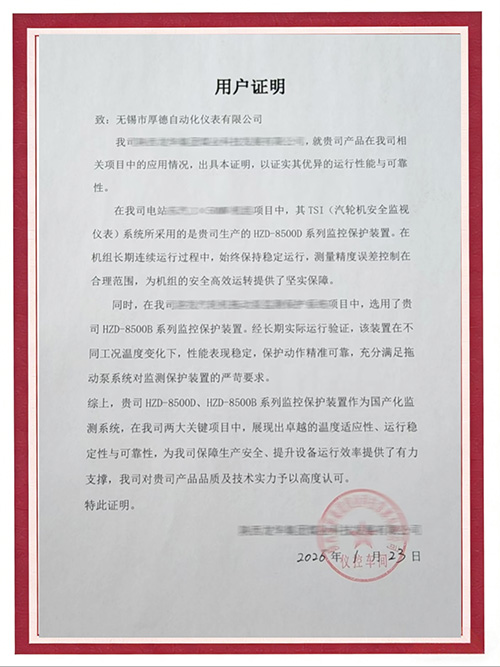 每一份用户证明,都是对我们产品从研发、制造到服务全流程的严格检验。厚德仪表始终坚持以用户需求为导向,以技术可靠为根基,以服务贴心为承诺,致力于为电力、化工、冶金等领域的旋转机械监测保护提供高性能、高可靠、智能化的解决方案。守护设备稳定运行,助力企业精益生产。