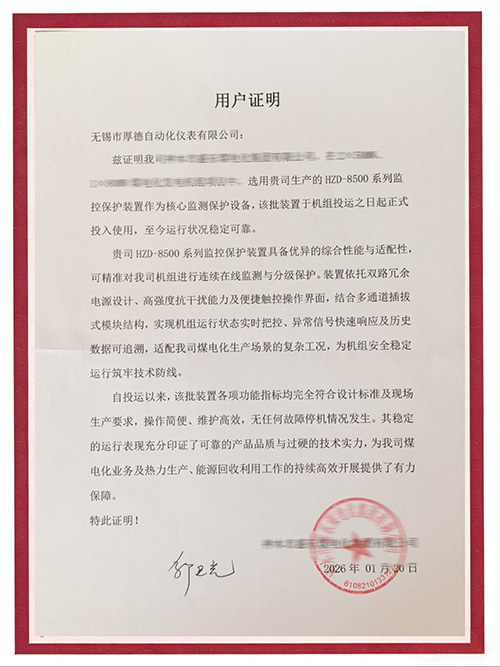 多份认可,一份信赖|厚德仪表HZD-8500系列监控保护装置获用户单位高度评价