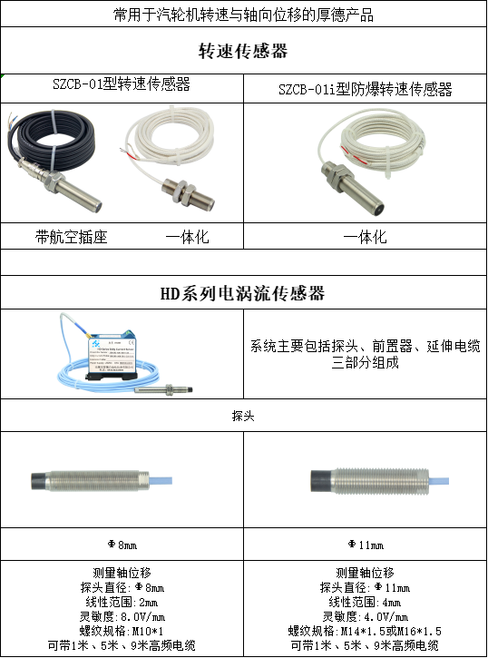 我公司自主研发的转速传感器和HD系列电涡流传感器,为汽轮机的转速与轴向位移监测提供了强有力的支持。凭借其高精度、高灵敏度的测量性能,这两款产品能够帮助运行人员实时掌握汽轮机的运行状态,提前发现潜在隐患,制定科学的维护策略,优化运行参数,从而有效提升汽轮机的安全性和可靠性,助力企业实现可靠稳定的生产目标。