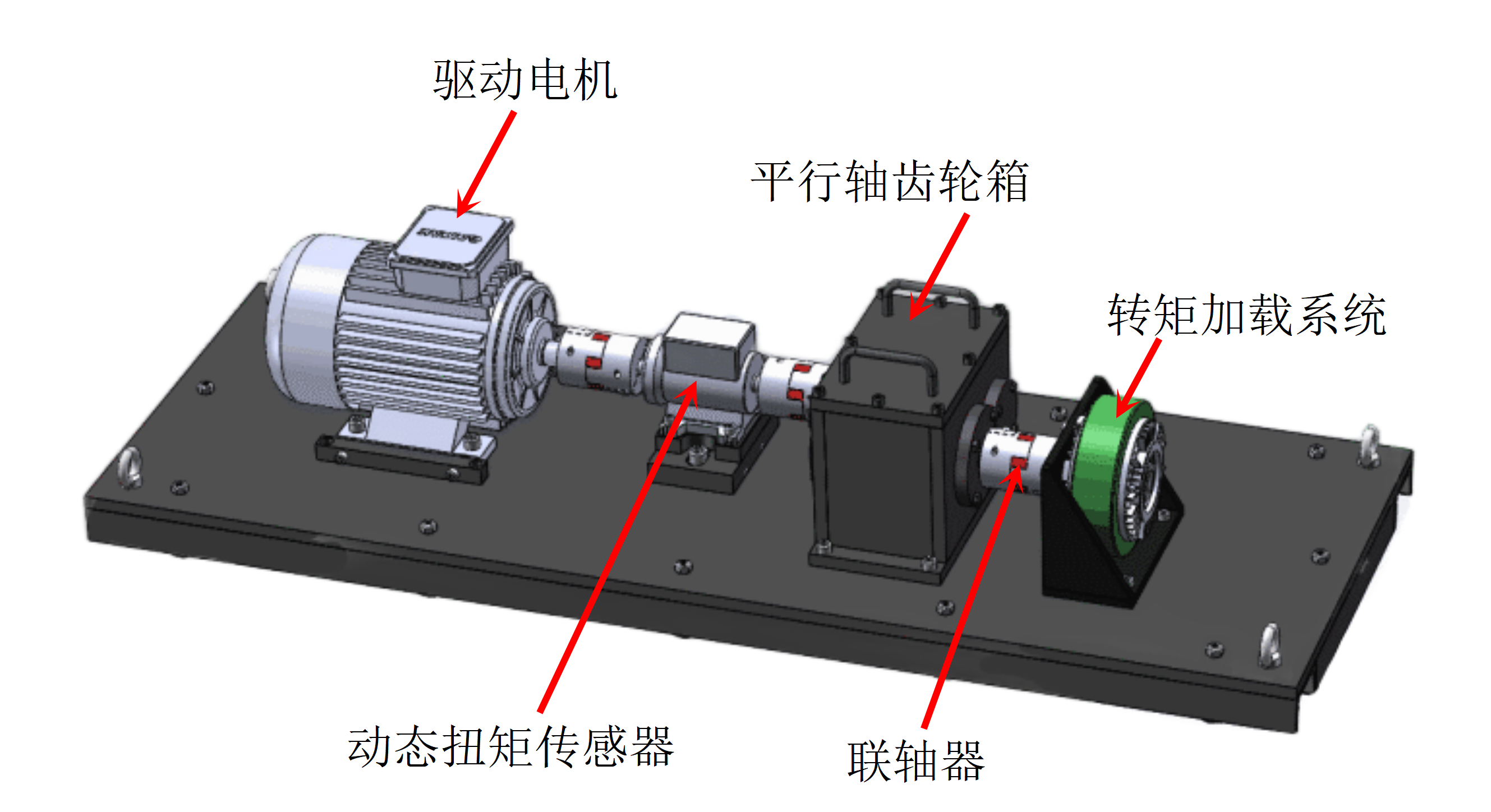 本实验系统由平台底板、三相变频电机、动态扭矩传感器、平行轴齿轮箱、转矩加载系统、联轴器、循环冷却系统、试验台控制系统组成。整体设备尺寸为1400mm×500mm×330mm。